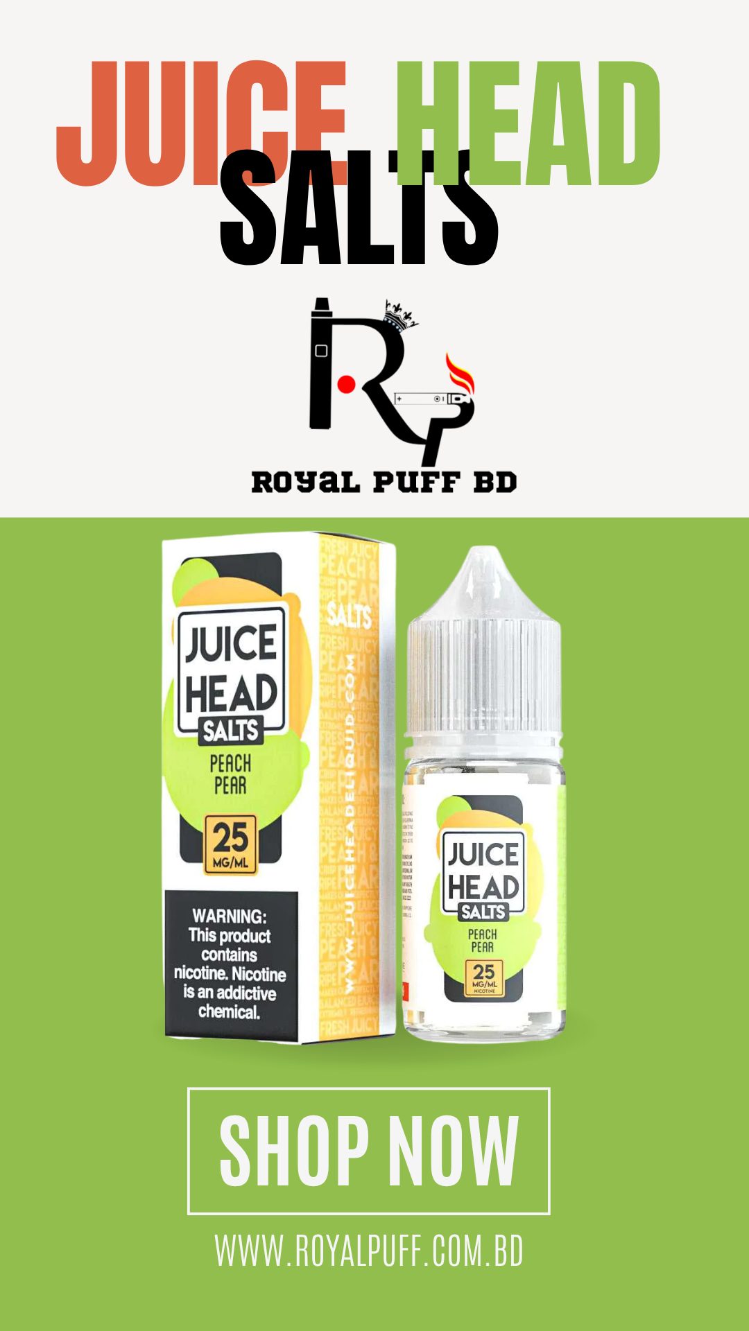 Now available at Royal Puff BD, the most trusted vape shop in Bangladesh for authentic vape juices and devices. Juice Head Peach Pear Saltnic 30ml